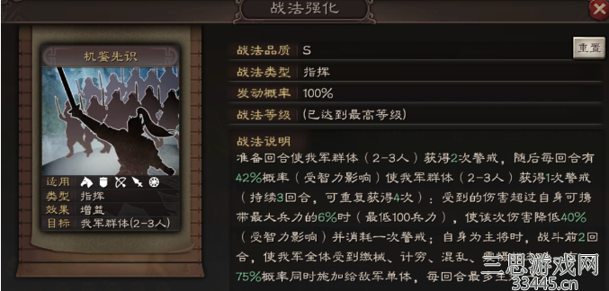 准备回合我方(2~3人)获得2次警戒,随后是每回合42%几率(2~3人)获得一次警戒,持续三回合,可叠加4次,【最差结果一回合有2人2警戒,最好结果一回合3人3警戒】。受到伤害超过自身可携带最大兵力6%时(最低100兵力),使该次伤害降低40%+(加号看智力),并消耗一次警戒;自身为主将时战斗前两回合我军全体受到缴械、技穷、混乱、震慑状态时,70%几率加给敌军单体,每回合最多一次。【一共两回合最多2个】