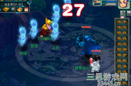 化生寺找扫地神僧(25,50,17点后消失),经验=等级X550,金钱=等级X50,有浮动。任务为特殊战斗(除物理不能使用其他攻击),正确最快杀法需5回合(不一定先杀菩提,但要按照复活的顺序),每杀错1次顺序扣1点善信(一回合2点哦),
