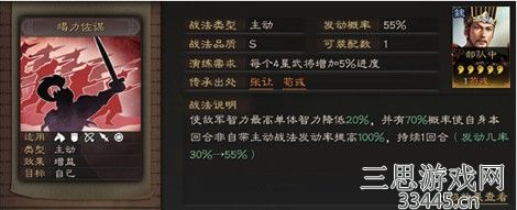 使敌军智力最高单体智力降低20% ,并有70%概率使自身本回合非自带主动战法发动率提高100% ,持续1回合(发动几率30%-→55%)