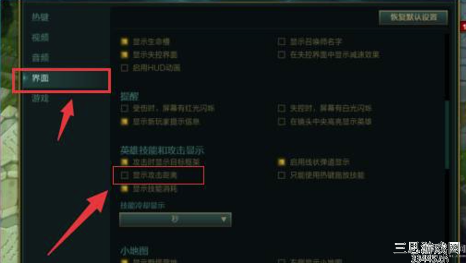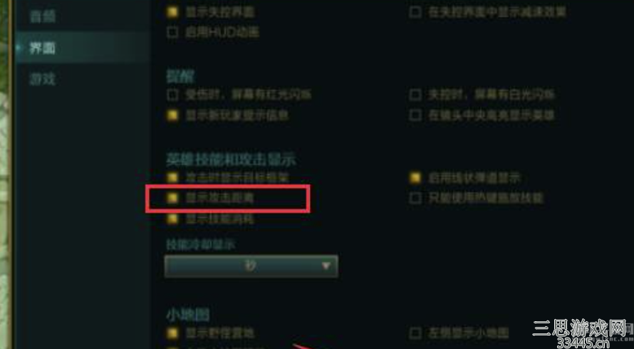 3、然后在技能和攻击显示选项中勾选显示攻击距离即可。