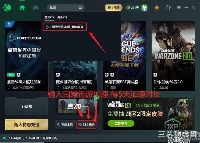 1、我们需要先注册外服暴雪账号外服暴雪账号是需要加速器协助才能成功注册的,下面我们就选择迅游加速器进行协助。开启迅游加速器,搜索战网国际服,加速【暴雪外服注册与下载】,迅游加速暴雪外服注册登录免费。无加速时长伙伴点击如下图中口令兑换,进入后输入【白嫖迅游加速】即可获得五天加速时长。