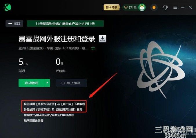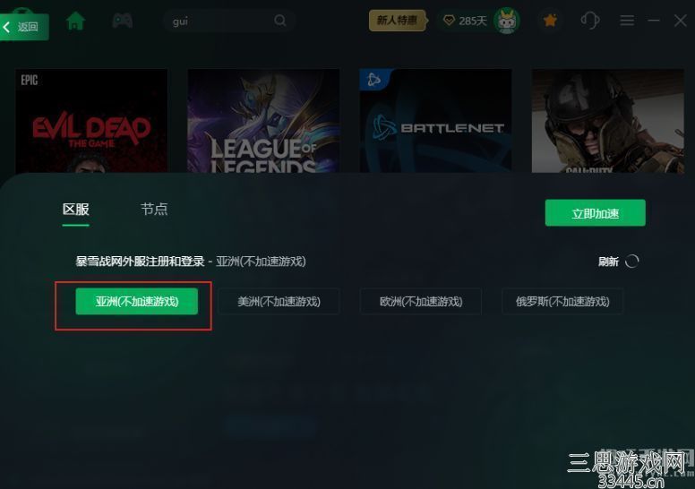 3、注册账号:单击“创建一个暴雪免费账号”推荐您选择【亚洲】区服并单击【立即加速】;
