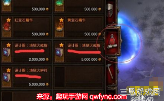 2、点击商人在店铺第3页界面中寻找地狱火戒指与地狱火项链图谱并购买图谱如下: