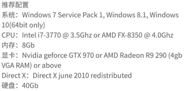 显卡:Nvidia geforce GTX 970 or AMD Radeon R9 290 (4gbVGA RAM) or above