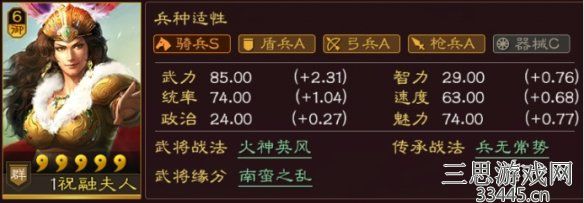 “多功能辅助”:自带输出、吃武力加成的治疗、以及提升队友武力值,比起孟获这样的纯输出,祝融夫人的使用场景会更多一些。