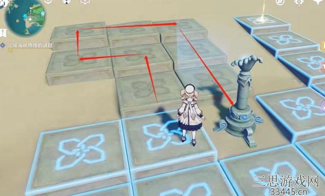 参拜尊像后,尊像雕像四周就会有18块解谜石板出现,而我们要的海袛尊像之谜的答案即是那只宝箱,当我们揭开谜底后,宝箱自动显示,大家要按任务提示踩对次序的石板去尊像雕像再参拜一次,并按如下图中红色箭头所显示的引导次序向前走,直到靠近尊像雕像。