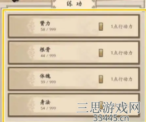 2、开局练功:由于属性高、练功收益高,4项属性应平均修炼。其中根骨与体魄可高出一点,因前期武功加上臂力与身法较高。到手的白最烂武功学了以后就维持在0级不修炼了,在18岁末以前就直接学了。因为18岁后就会为自己安排战斗训练了,想要胜利就必须修炼武功。19岁时只修炼四项属性中最低一项,从此闯江湖再也不用修炼。
