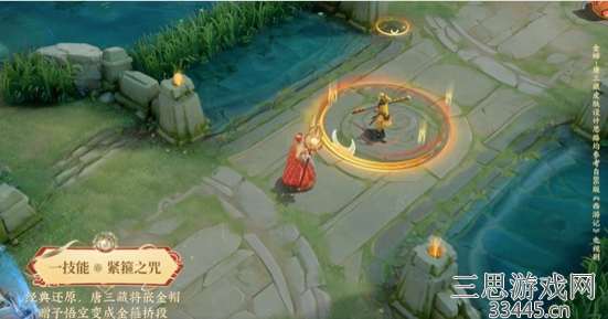 一技能特效是参考唐三藏给孙悟空嵌金帽变成紧箍这一桥段来设计的,技能圈变成紧箍的形状