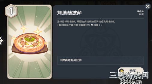 料理事件牌【烤蘑菇披萨】使用时直接治疗1点,两回合结束阶段一次多治疗1点,划算美味不贵,个人建议带1-2。