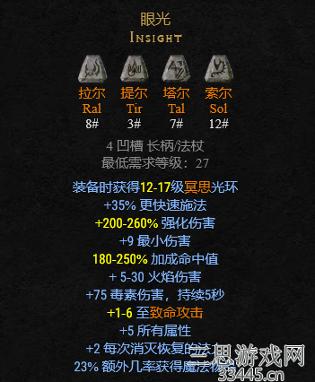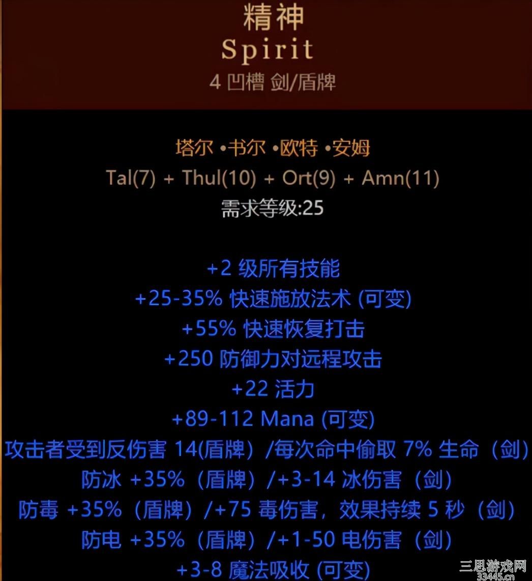 作为一件万金油装备,精神灵符可以说是真正的性价比之王,底材是4孔剑/盾(四孔剑在早期是非常不错的获取方式,盾我们说一般君主盾都是地狱难度才能得到,因此早期刚好能过渡到古代人契约),符文由7号、10号、9号、11号组成,只要通过这4个低等级符文,你就能获得+2全部技能,最多35%快速施法,55%打击恢复,等等很多属性。