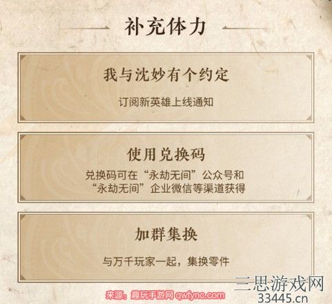 5)或选择“补充体力”通过以下途径获得额外体力,如下图订阅新英雄上线通知、使用兑换码、加群集换。