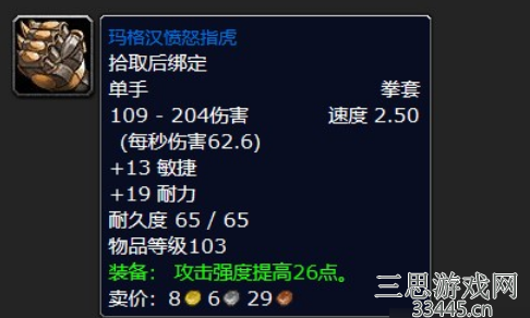 6、玛格汉愤怒指虎单手拳套物品等级103级武器秒伤62.6攻速2.50主要特性攻击强度提升26点、耐力提升19点、敏捷提升13点。