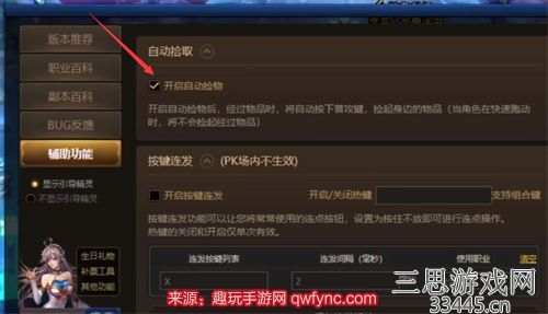 第三步:点击辅助功能即可看到自动拾取的设置页面,在开启自动捡物前打上勾即可开启一键拾取。