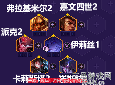 阵容组成:弗拉基米尔、嘉文四世、派克、伊莉丝、卡莉斯塔、崔斯特