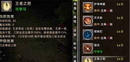 13、王者之路-0级:王者竞技吃鸡模式专属技能,王者一怒,血流千里,三职业攻击提升100%,移动速度增加15%。