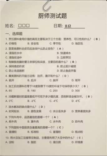 以上就是厨师考核的答案介绍,其实有的问题都是贴合显示生活中的,大家可以根据以上的答案进行回答,之后就可以拿到厨师证了。