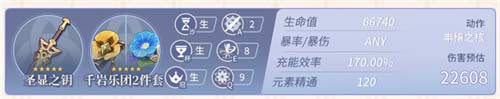 当妮露使用专武【圣显之钥】带【千岩两件套】+【乐团两件套】时,毕业面板为: