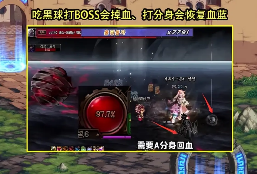 在小黑屋中,玩家的HP/MP都会持续减少,用平X打死BOSS分身可以快速恢复自身血蓝、要特别注意会追踪的红球,如果和BOSS相撞BOSS血量会回满、所以务必要把红球引到BOSS外的区域。