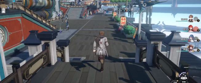 3、玩家一直往桥的前面走,然后在往左边拐,接着在笔直走,在楼梯的旁边可以看到梓桥站在那里;