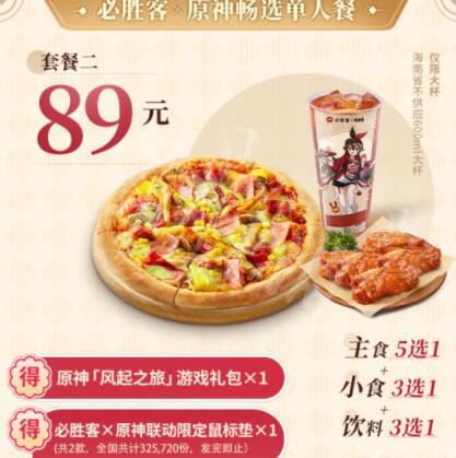 奖励:原神【风起之旅】游戏礼包x1,必胜客x原神联动限定鼠标(共两款),必胜客x原神联动限定餐盘x1