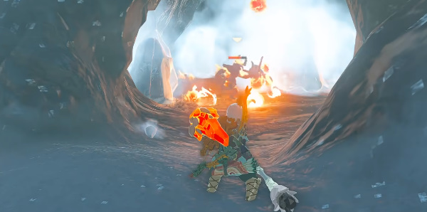 1、来到指定位置坐标后我们可以看到面前被血覆盖住的洞口,使用火把将积雪消融。