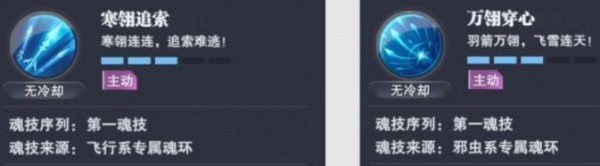 "寒翎追索"和"万翎穿心"是第一魂技,它们都是主动技能,前者是飞行类魂环,后者则属于邪虫类魂环。