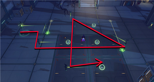 第二关:有四个激发器,右下角的激发器顺时针旋转2次,右下靠近中间的激发器逆时针旋转2次,左上方的激发器逆时针旋转3次,右上靠近中间的激发器顺时针旋转1次,再移动位置,光线一次性穿透即可通过;