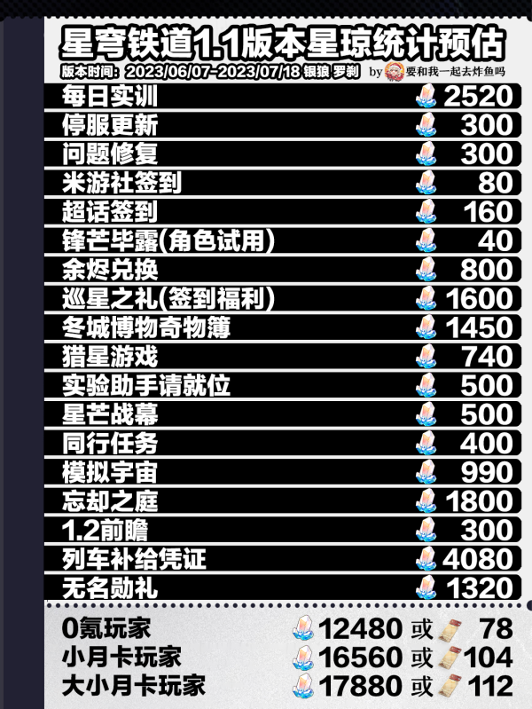 1、星穹铁道1.1版本星琼统计预估:0氪78抽左右,大小月卡112抽左右
