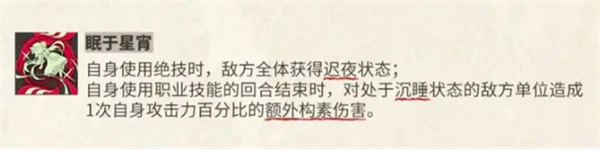 睡莲的技能设计注重控制与削弱,例如“眠于星宵”可以在使用绝技时为敌人施加“迟夜”状态,降低他们的攻击力和速度,并在沉睡状态下造成一次构素伤害。