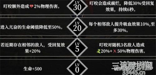 她的天赋在初始会解锁加30破甲,以及加500生命,升到5级时解锁若近期存在和自己相邻的目标,提升20%受回复效果,以及叮咬变成对范围内随机三人造成输出,升到20级能解锁让进入亢奋的生面阈值降低到50%,或每个相邻的敌人提升自己10吸血效果,升到30级能解锁让叮咬额外造成2%生命值的物理输出,或叮咬降低目标30%受回复效果维持6秒。