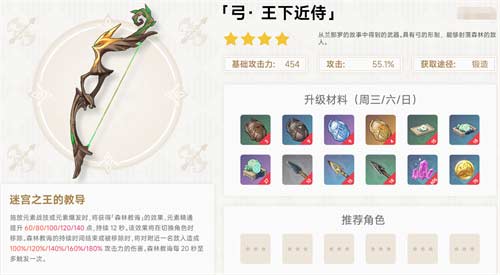 王下近侍的基础攻击力虽然不高,但是武器副属性带来的攻击力加成很高,在释放技能之后还能增加元素精通,效果结束后还能对敌人造成伤害,非常适合温迪和菲谢尔之类的角色进行使用。