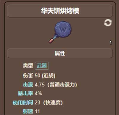 华夫饼烘烤模是一个近战武器,玩家使用华夫饼烘烤模时,每次攻击都会发射一个显著受到重力影响的华夫饼射弹。并且烘烤模本身在接触时有几率造成狱炎减益。
