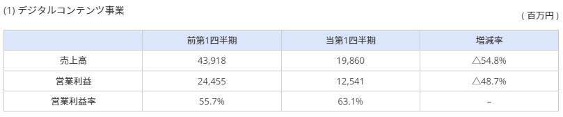 卡普空在该季度销售额达到 252 亿 3200 万日元,同比下降 47.9%;营业利润为 120 亿 6100 万日元,同比下降 48.9%;经常利润为 128 亿 3000 万日元,同比下降 46.4%;归属母公司股东的净收入为 90 亿 700 万日元,同比下降 48.1%。