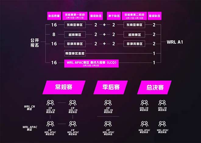 来自WRL APAC赛区的队伍将通过区域性赛事晋级至WRL APAC赛区资格赛,进而获得通往英雄联盟手游亚洲联赛的机会。