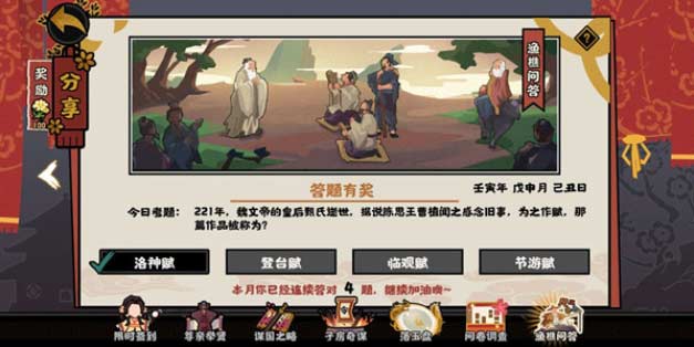 曹植感念旧事作赋的作品是?这是渔樵问答今日的考题,陈思王曹植听闻皇后甄氏逝世写下了一篇赋文,小编不得不说曹植是多么感性的一个诗人,小编就不兜圈子了,这就带领大家进入我们今天的正题,有需要的玩家一起来看看无悔华夏渔樵问答8.4答案介绍吧!