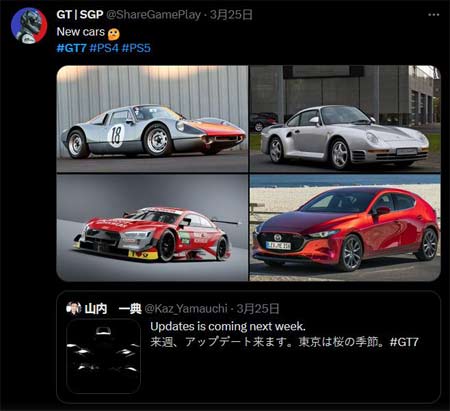 山田一典在推特上放出了《GT 赛车 7》将于下周推送免费更新车辆,本次更新将带来五辆新车。有玩家从预告片的车辆剪影判断出了这五款车的车型:
