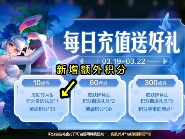 在本月的19号,王者荣耀将会迎来一次小更新,在这次更新之后就会上架之前宣布的一些福利活动,其中就包括了新版的充值返利活动和宝箱活动。作为不少玩家获取皮肤碎片的主要途径之一,充值返利活动的每次上线都会有不少玩家参与,尤其是最低档位的奖励更是不少玩家必参加的一项。如今充值返利活动进行了改版,玩家只需要10点券就可以皮肤碎片的奖励,还有30点荣耀积分,如果不要皮肤碎片的话,10点券可以获得40点的荣耀积分,还是非常划算的。尤其是最近有不少大神玩家总结了获得荣耀水晶最省钱的方法,所以多搞一点荣耀积分,后面抽颗荣耀水晶换款典藏皮肤也挺好。