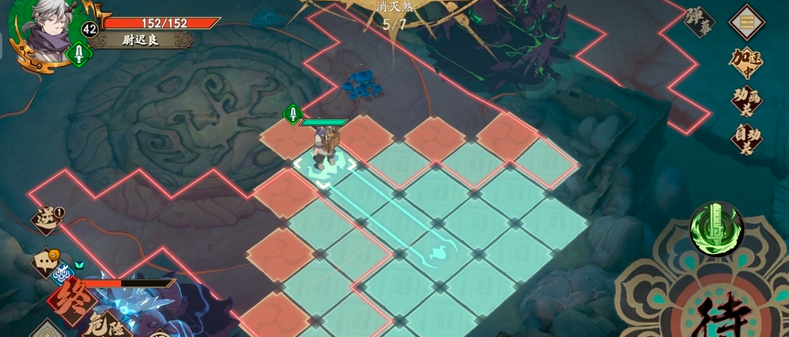 最后一个回合,尉迟良触发蘑菇buff,直接走向最后的绿阵,完成第三个煞的击杀。