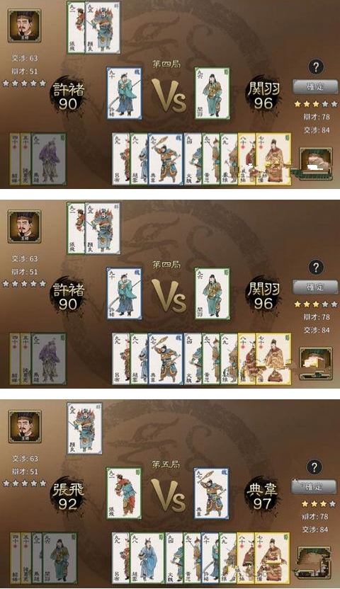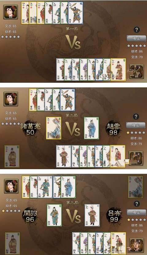 补遗2-吕布赵云典韦能灭大部分牌,他们各自又被特定的3张牌克制(吕布怕刘备曹操貂蝉,赵云怕刘备诸葛吕布,典韦怕曹操吕布赵云),这三位算是最好用的武将了。只要对方手里没有克制他们的牌或者只有一张,就可以赌一把运气,但尽量不要在第一局就赌。看情况可以放在第二第三轮,特别是当第一第二轮成功废掉电脑的克制牌之后。