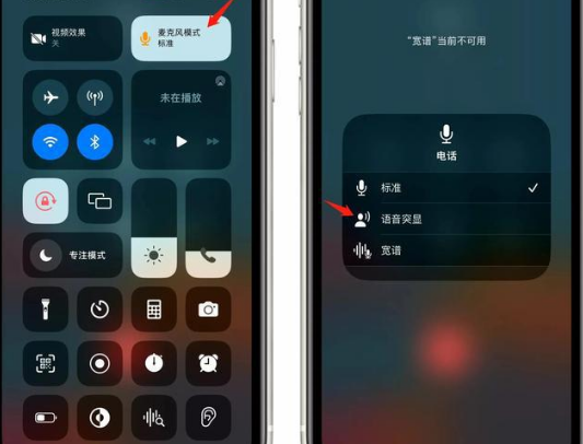 当我们用iPhone打电话时,下拉调出控制中心,点击麦克风模式就可以看到语音突显功能,选择这个功能后,iPhone会对当前环境噪音进行主动降噪,使通话更清晰(对方听的更清楚)。
