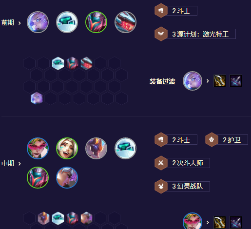前期尽量用强势棋子与羁绊打工,保证打工棋子2星,进而稳定血量健康,步入7与8阶段,7与8阶段低费打工卡向以4-5费棋子为核心阵容转型。