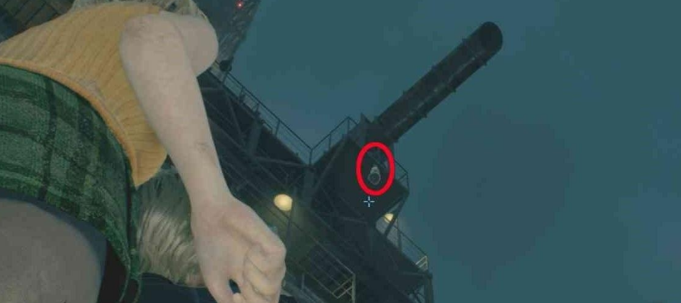 离开货物堆场穿过门,沿路直走,抬头射击顶上挂着的银色容器。