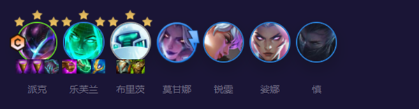 棋子组成:派克、乐芙兰、布里茨、莫甘娜、锐雯、娑娜、慎