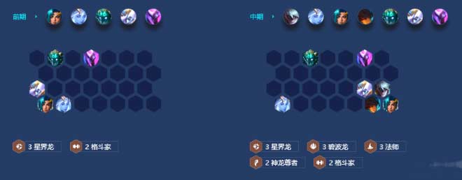 抢节奏升人的数量,一至四拉四,二至二拉五,三至一拉六。通常可以3-5 7(经济积累快)再小搜点品质。补位神龙尊者增加卡莎的输出。4-2拉8个人口,大把大把的搜卡钱用完了,凑齐阵容就可以了。星界龙+碧波龙经济够撑8。八人口阵容形成之后,四阶段基本上都能大连胜了。等索姆的两星就能存钱了,有钱了再果断拉人口,上巴德或者索拉卡。