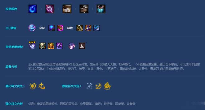 开局第一个抢夺装备眼泪或法棒的。制作最核心蓝buff,与莫雷洛秘典一起交给去卡莎工作。早期以三星界的三位法师——三碧波龙转型为斯卡纳,弗拉基米尔,拉克丝,墨菲特,塔莉亚,卡莎。能充分发挥经济积累和战力。