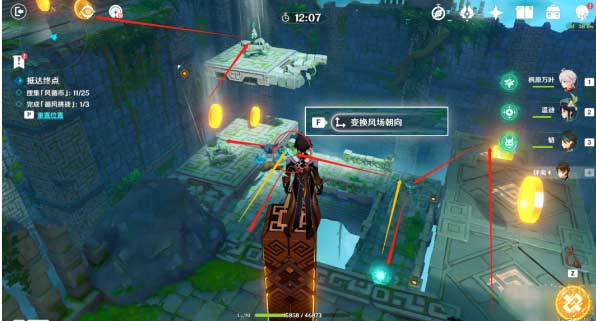 5、先【停止附近风场】,触碰大微粒,跟着红色箭头逆时针绕一圈,收集元素微粒,再跟着黄色箭头方向,借助机关向上风场飞上来,(如果跑的快,可以直接飞向右边),在中间的机关【变换风场朝向】,飞到右边,同样的操作,跟着红色箭头方向,再飞过来,然后往前走到终点即可完成台挑战!