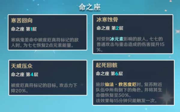 3.E技能的治疗量,分为两种,一是在寒病鬼差持续期间,七七普攻和重击命中敌人时,基于七七的攻击力恢复队伍所有角色生命值,这个使用七七驻场输出。二是不停环绕着角色的小圆球,持续恢复当前角色生命值,期间可以恢复3次,非常适合奶妈辅助,如10技能,2500攻击力,一次至少恢复5000生命值以上,足以满足任何主C。