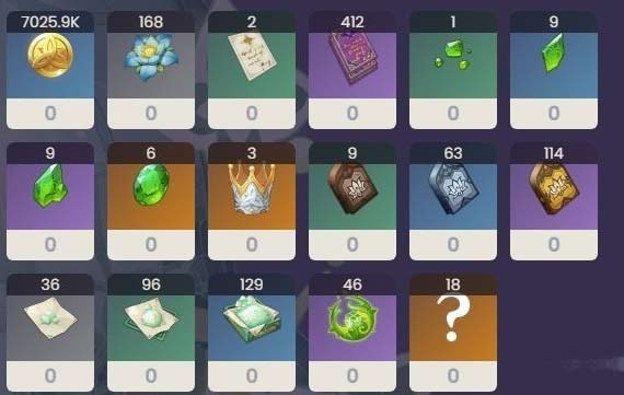 碧翡碎屑*1、碧翡断片*9、碧翡块*9、生长碧翡*6、劫波莲*168、灭诤草蔓*46、蕈兽孢子*18、荧光孢粉*30、孢囊晶尘*36、摩拉*420000。