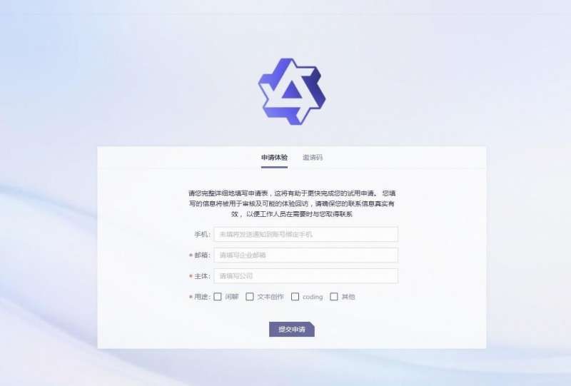 3、登录成功后,在申请页面中进行输入手机号、企业邮箱、公司名称以及选择用途,