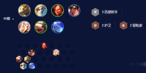 二、羁绊组成:4迅捷射手、4护卫、1冒险家、2怒舆龙